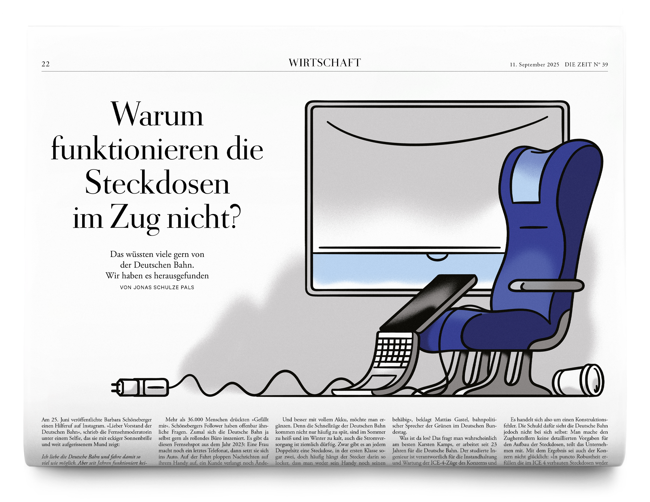 »Warum funktionieren die Steckdosen im Zug nicht?« (»Why don’t the sockets on the train work?«), Illustration for DIE ZEIT, Nr. 39/2025